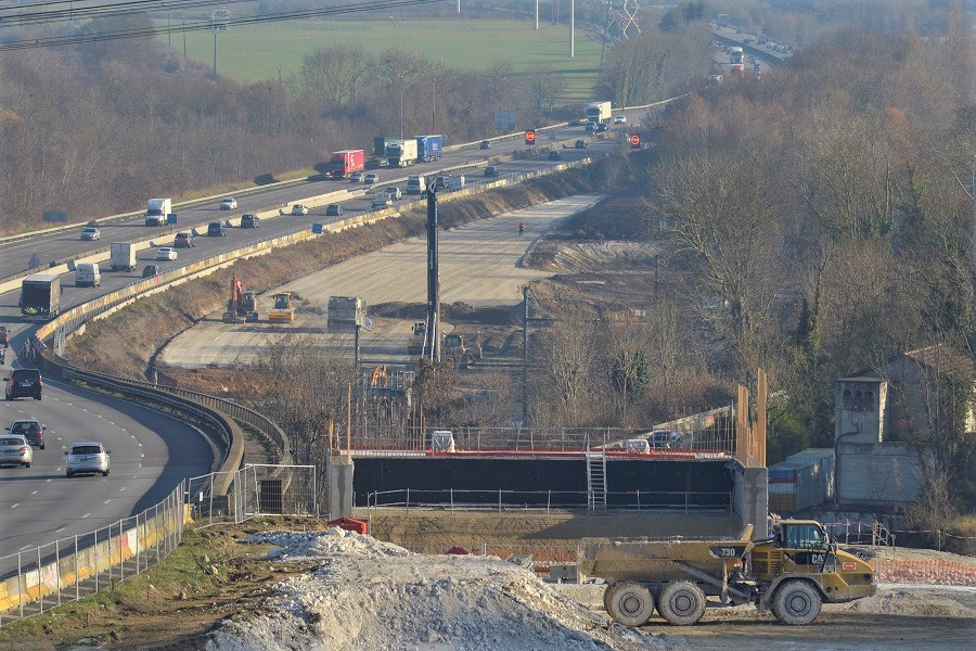 Durant cette nouvelle phase de travaux, la SAPN intervient sous le viaduc de Guerville, entre les voies SNCF et la RD113 en vue de la construction d’une des piles qui soutiendra l’ouvrage.