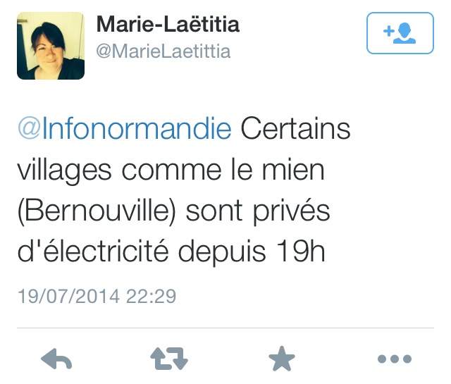 Une abonnée d'infoNormandie sur Twitter indique qu'il n'y a plus d'électricité depuis 19 heures dans son village de Bernouville, entre Gisors et Etrepagny.