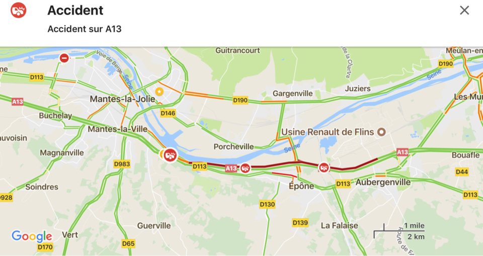 Un grave accident de la circulation est signalé ce mardi matin sur l'autoroute A13 dans le sens Paris - Rouen. Il s'est produit à hauteur du km 45 sur le viaduc de Guenille après la centrale EDF de Porcheville, entre les sorties Épône et Mantes-la-Ville (Yvelines).