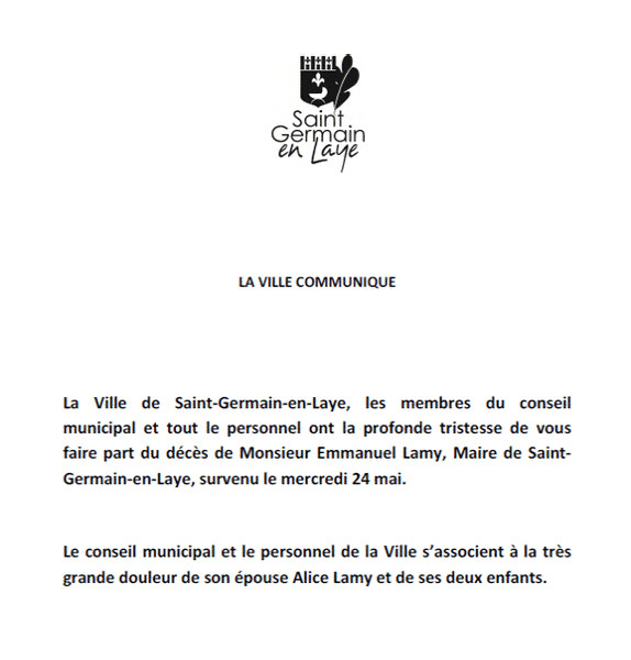 "Tristesse et émotion en apprenant le décès d'E.Lamy maire @StGermainLaye.Tout mon soutien et mes condoléances à sa famille et ses proches" pic.twitter.com/BfTjTs1JIj