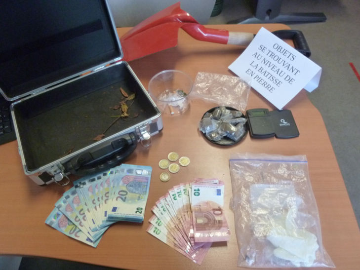A l’endroit où les deux hommes ont pris la fuite. les policiers vont retrouver une mallette renfermant 33,52 grammes de résine de cannabis conditionnée et 560 euros en numéraire. Un portefeuille contenant 330 euros et un bloc de 58,22 grammes de résine de cannabis, jetés par l’un des fuyards, sont également découverts.