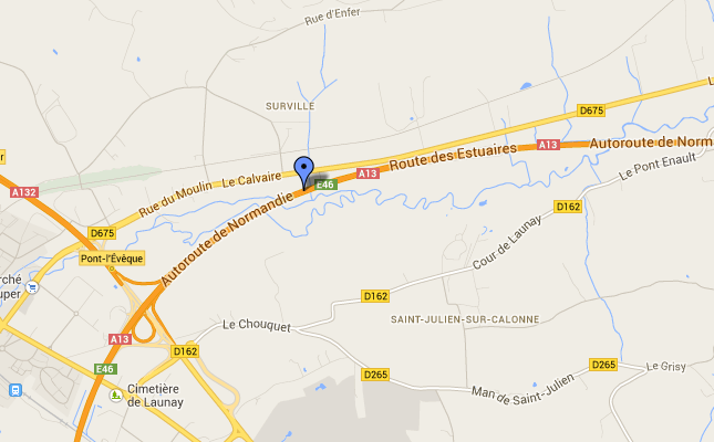 La collision s'est produite peu avant d'arriver à la bifurcation Pont-l'Evêque/Lisieux, sur la commune de Surville. L'A13 a été coupée pendant une heure en direction de Caen (@Google Maps)